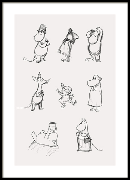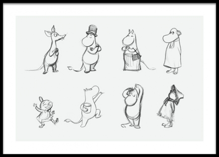 Ces posters représentent tous nos personnages favoris de la Vallée des Moumines. Trouvez votre préféré parmi Moumine, Maman Moumine, Papa Moumine, Pipo, la demoiselle Snorque, Jolimie, Sniff et Hemulen. Si vous avez prévu de refaire la chambre de vos enfants, c'est l'occasion ! Amusante tout en restant stylée, cette collection est à ne pas manquer ! Les détails des dessins à la main donnent à l'affiche un style authentique et s'associent parfaitement entre eux pour un mur de cadres enfantin.
