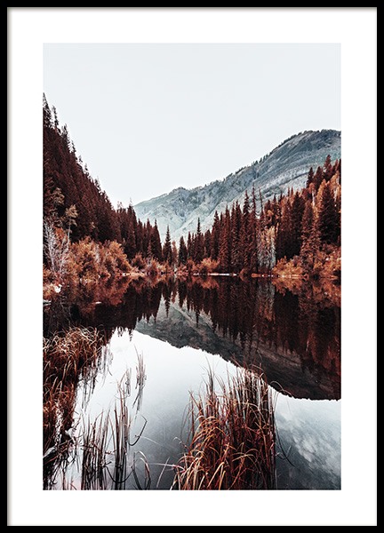 Photographie d’un lac au coucher du soleil avec des arbres rouges au premier plan et des montagnes à l’arrière-plan. Cette belle affiche parvient vraiment à capturer la beauté de la nature et toutes les merveilles qu’elle a à offrir. Donnez à votre intérieur un nouveau look bien mérité avec ce chaleureux poster, un choix parfait pour les amateurs de nature.