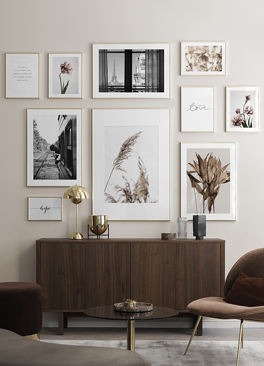 Photographie en gros plan de fleurs séchées beiges. Les affiches botaniques s’adaptent à chaque pièce, et en fonction de votre propre style, elles se marient à merveille avec d’autres motifs botaniques ou de l’art photographique en noir et blanc pour un look chic et intemporel !