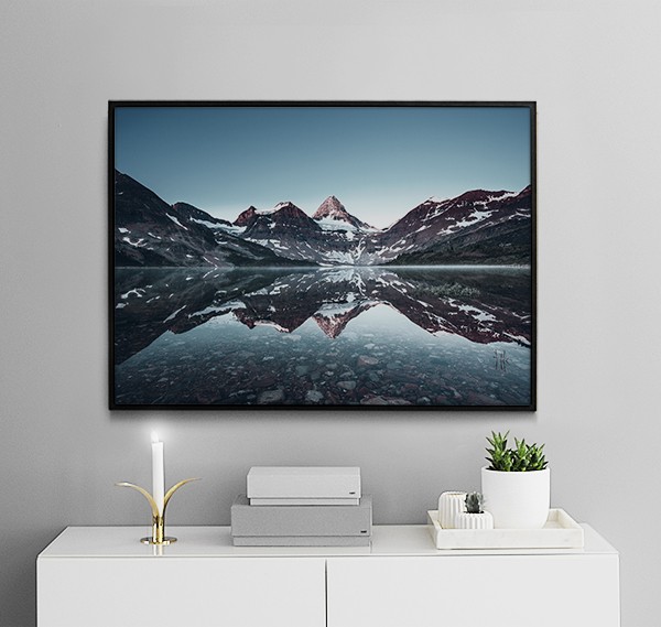 Affiche de paysage naturel: montagne au sommet enneigé et son reflet dans l’eau. Une image harmonieuse et élégante qui mettra en valeur vos murs. Cette affiche est aussi belle seule sur un mur qu’associée à un texte ou une citation philosophique encadrée.