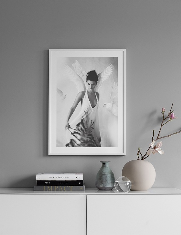 L'affiche photographique Halo de Tove Frank issue de la série Essence est l'un de nos motifs minutieusement sélectionnés. L'affiche Halo reproduit une belle photographie en noir et blanc représentant une femme portant des ailes d'ange blanches. Les colombes blanches qui entourent la femme créent une sensation de paix et d'amour et symbolisent parfaitement l'ambiance qui caractérise les créations de Tove. L'affiche Halo de Tove Frank « intègre » un passe-partout qui encadre joliment le motif.