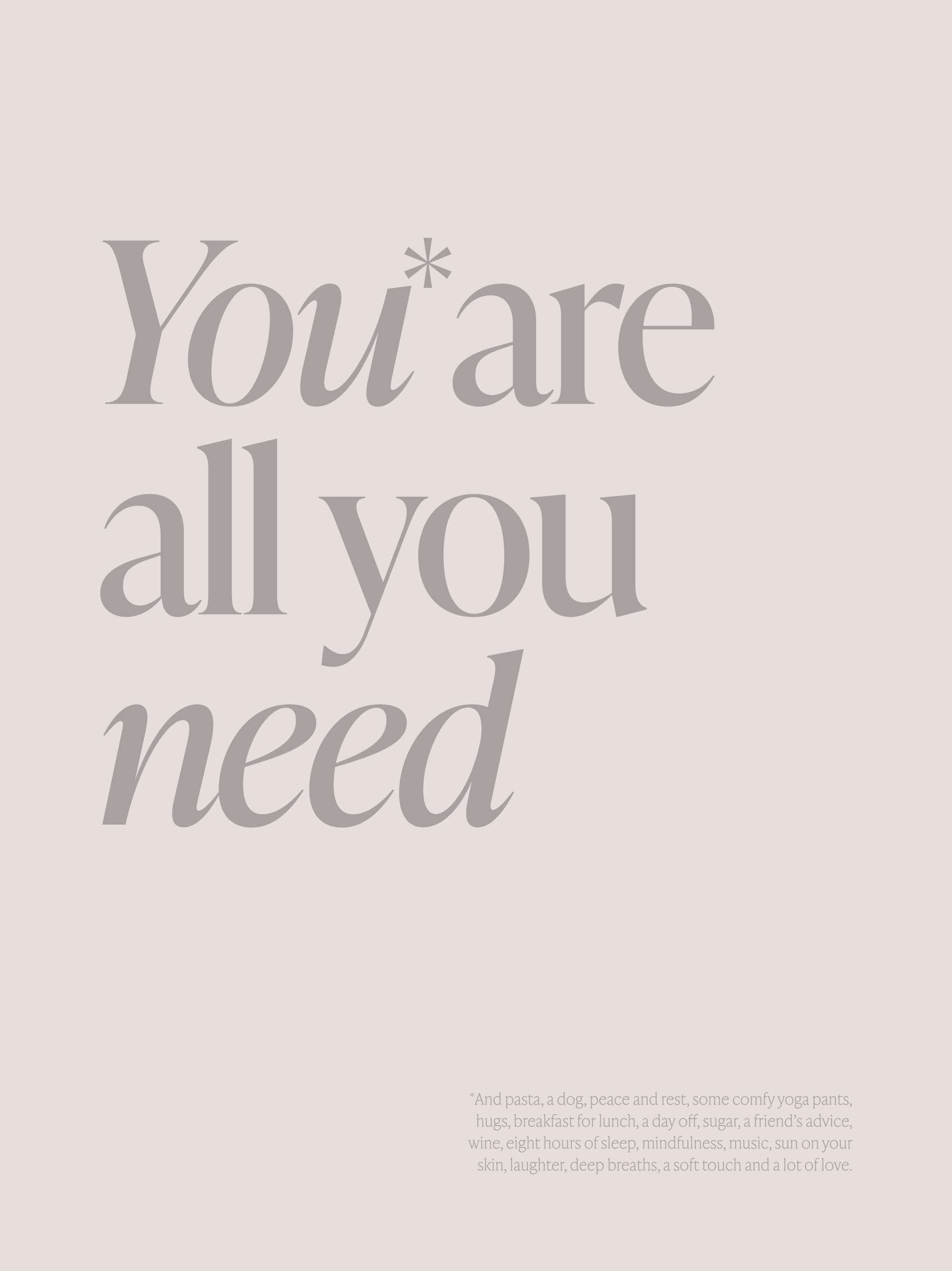À partir de 8,45 €Affiche de citation en nuances de beige qui dit "You* are all you need" avec une astuce en bas où il est dit "*And pasta, a dog, peace and rest, some comfy yoga pants, hugs, breakfast for lunch, a day off, sugar, a friend's advice, wine, eight hours of sleep, mindfulness, music, sun on your skin, laughter, deep breaths, a soft touch and a lot of love". Accrochez cela dans votre chambre ou salon et laissez-le servir de rappel amusant des bonnes choses de la vie.