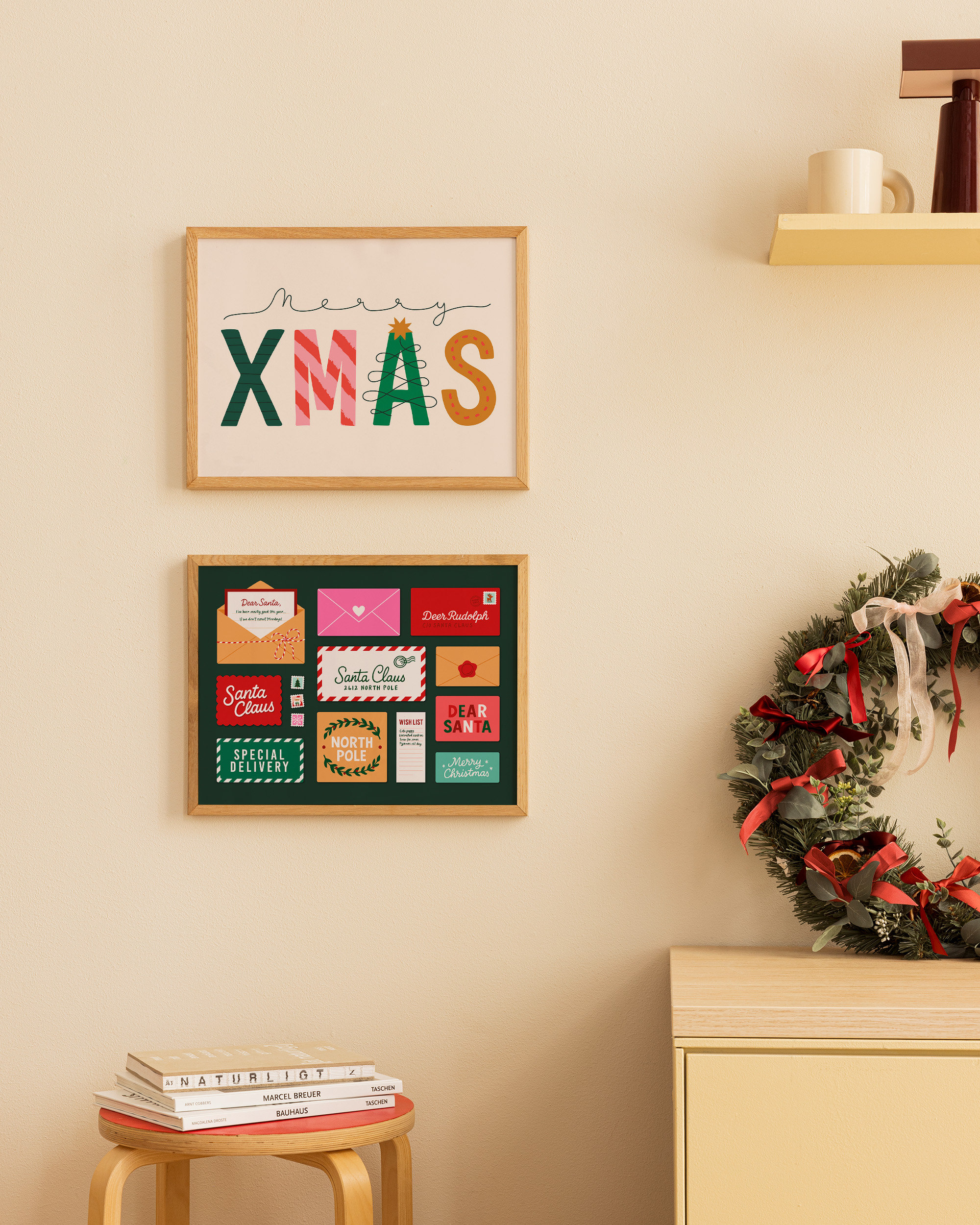 À partir de 13 €Affiche de Noël avec des lettres festives et des cartes aux couleurs rouge, verte, rose et orange présentant les textes "Dear Santa" et "Merry Christmas" sur un fond vert foncé.