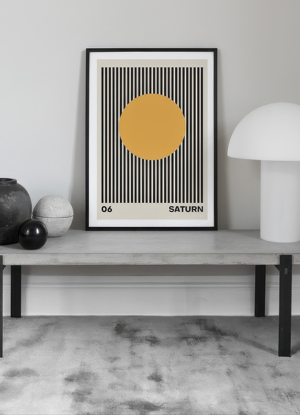 Illustration graphique d’un cercle orange devant des rayures noires sur un fond beige, avec le texte « 06 SATURN » en dessous. Cette illustration moderne et colorée ajoutera un look frais à votre intérieur tout en gardant un style intemporel !