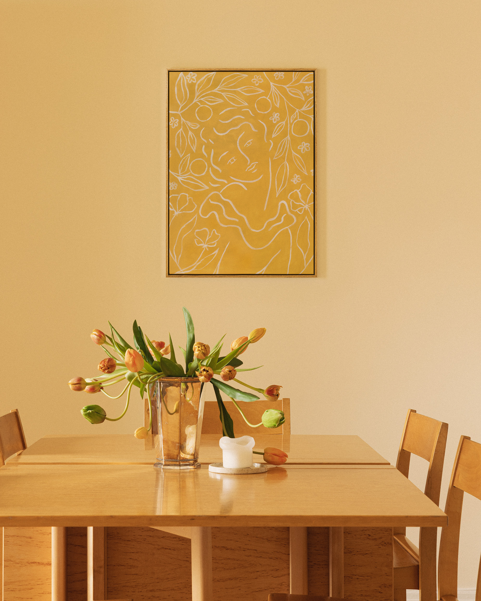 Une toile aux illustrations au trait représentant un visage, des feuilles, des fleurs et des agrumes sur un fond jaune. Une décoration murale simple et minimaliste.