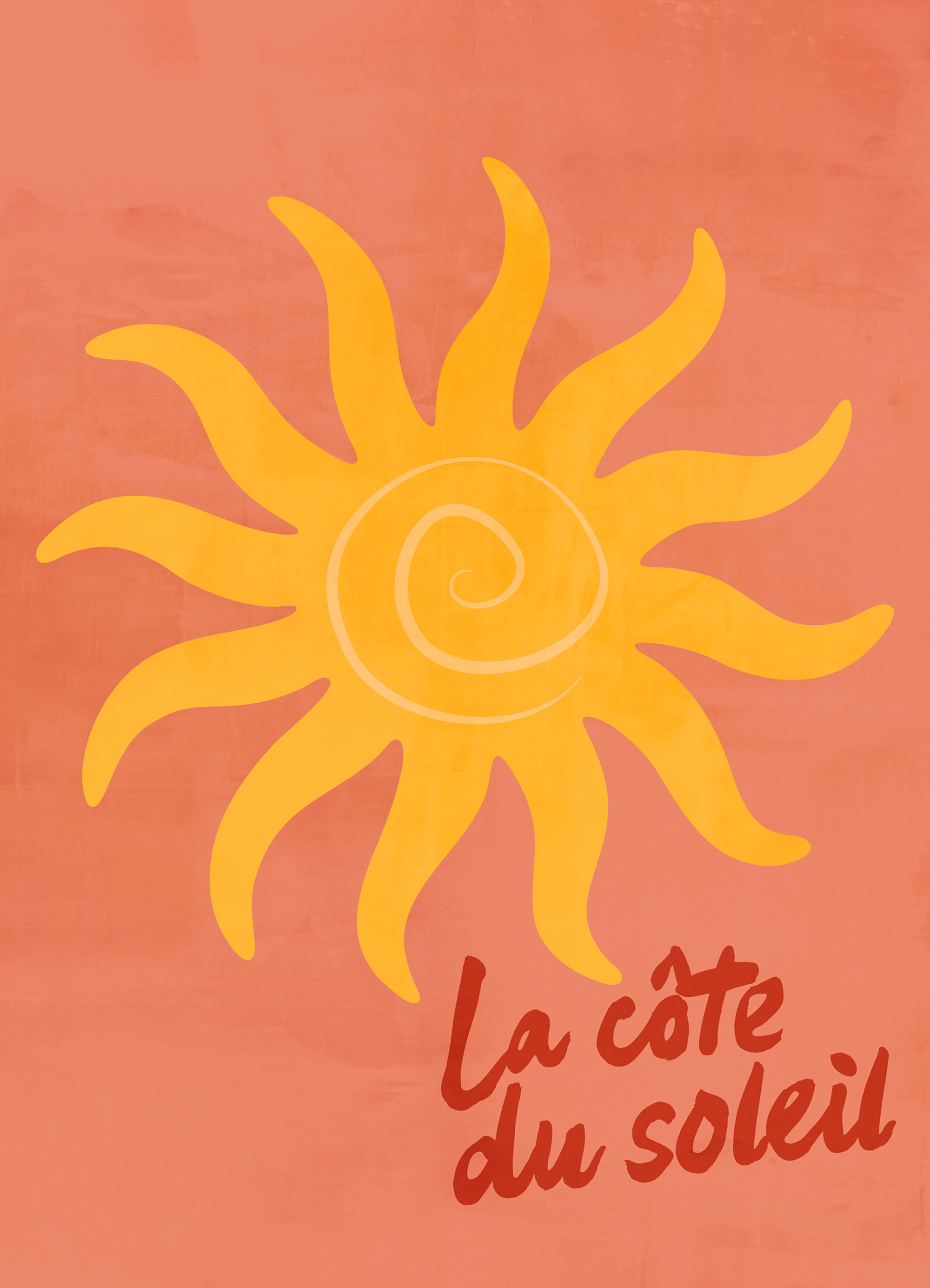 À partir de 7,95 €Une affiche représentant un grand soleil jaune aux rayons ondulés et motif en spirale sur un fond pêche. Le texte « La côte du soleil » apporte une touche charmante à ce tableau chaleureux.