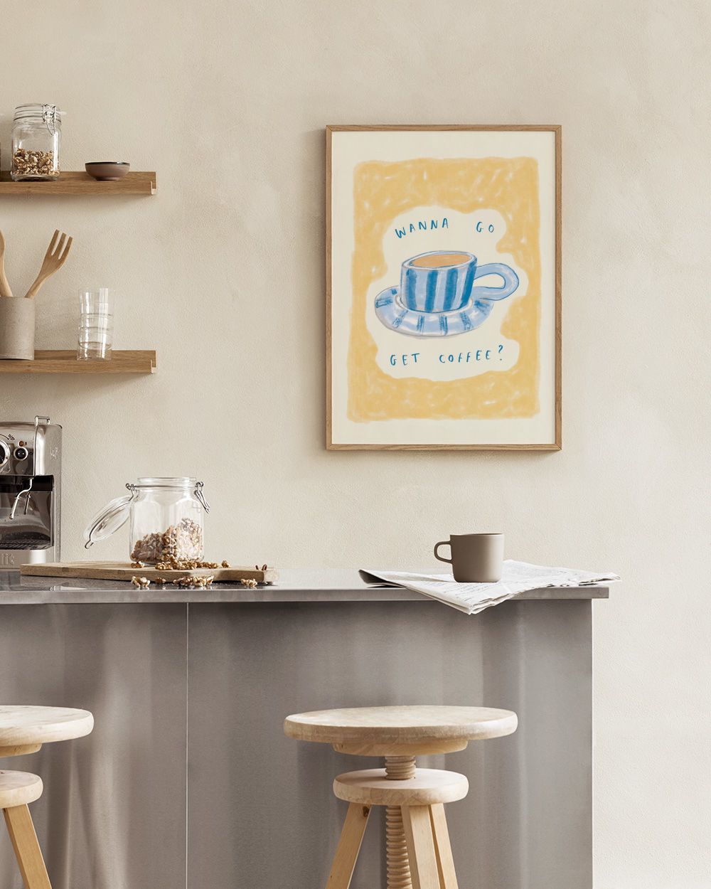 À partir de 9 €Une affiche charmante représentant une tasse de café à rayures bleues sur un fond jaune, accompagnée du texte "wanna go get coffee ?". La décoration murale idéale pour votre cuisine.