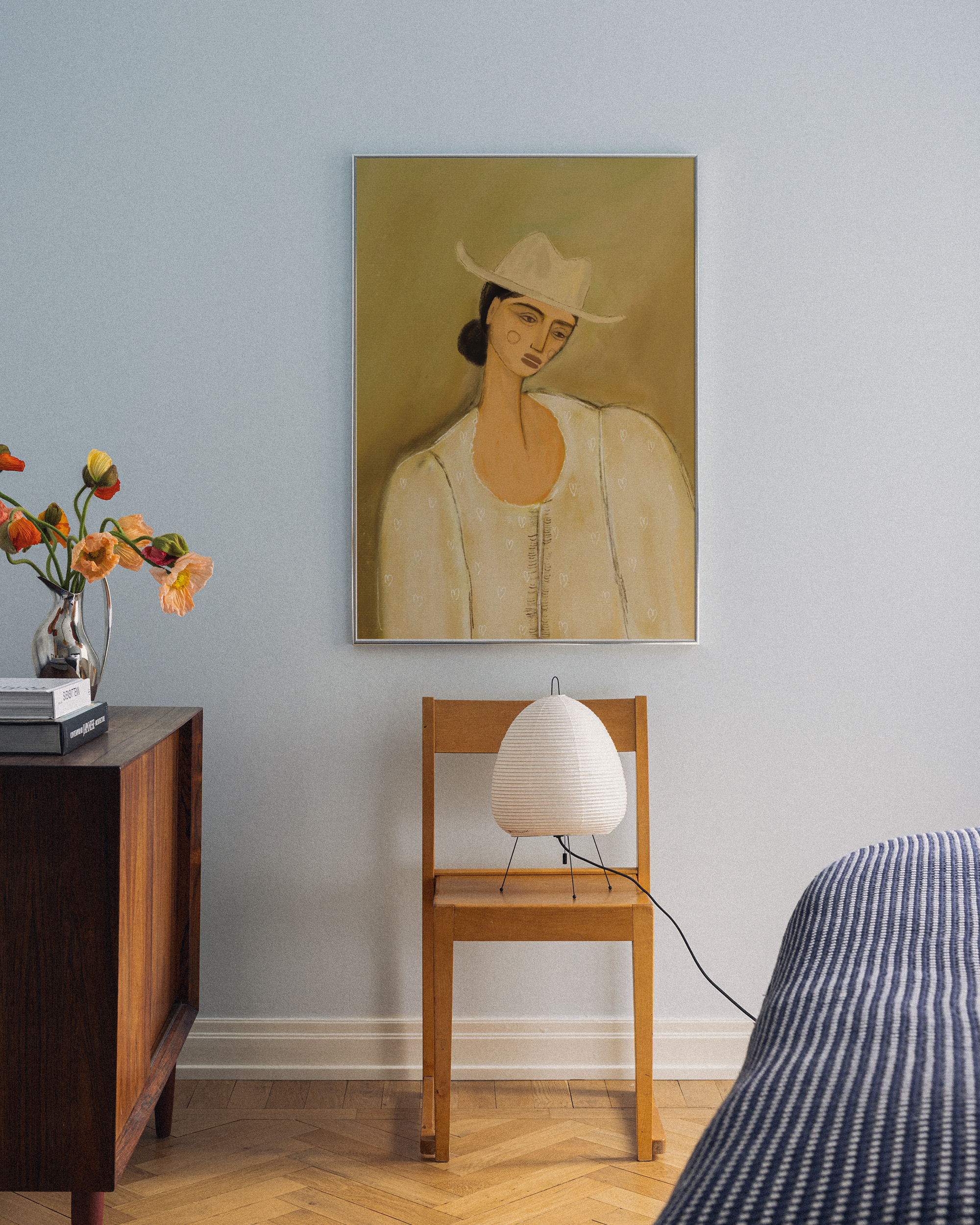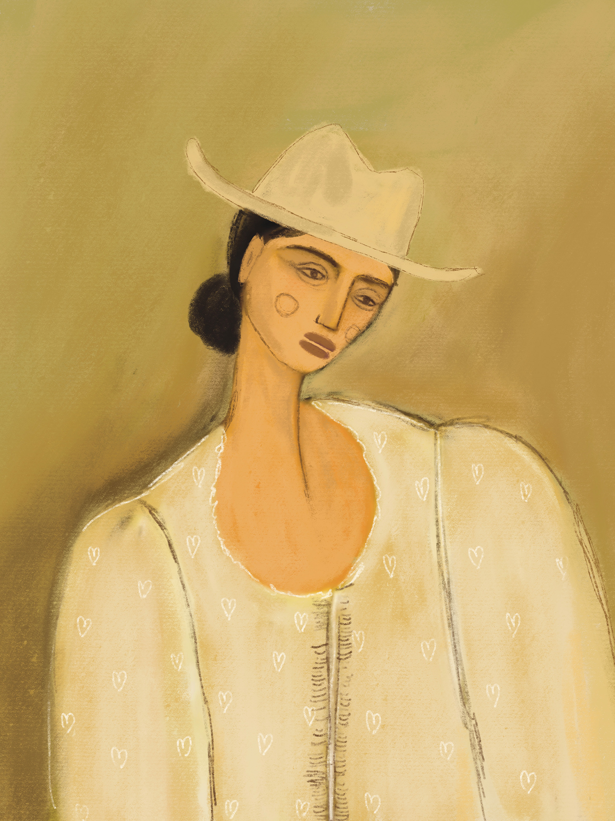 Une affiche représentant une personne portant un chapeau clair et un chemisier crème à motifs de cœurs. Un tableau parfait pour ajouter une touche charmante à votre intérieur.