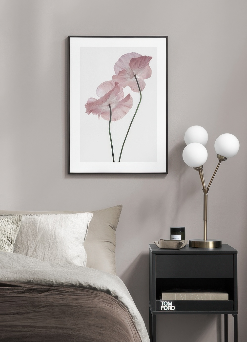 Photographie de deux coquelicots roses aux tiges vertes sur un fond gris clair. La délicatesse des coquelicots et les teintes de rose de cette affiche en font l'accessoire de déco idéal pour apporter une touche de romantisme à votre intérieur.