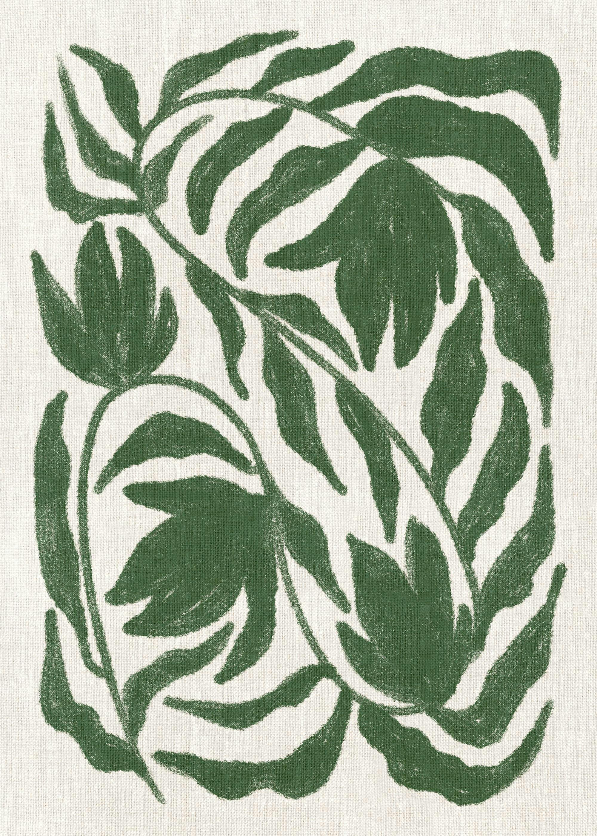 Illustration d’un vase clair orné d’un motif floral vert sur un fond vert avec une texture à effet textile. Ajoutez des nuances de vert à votre maison pour créer une ambiance calme et chaleureuse !