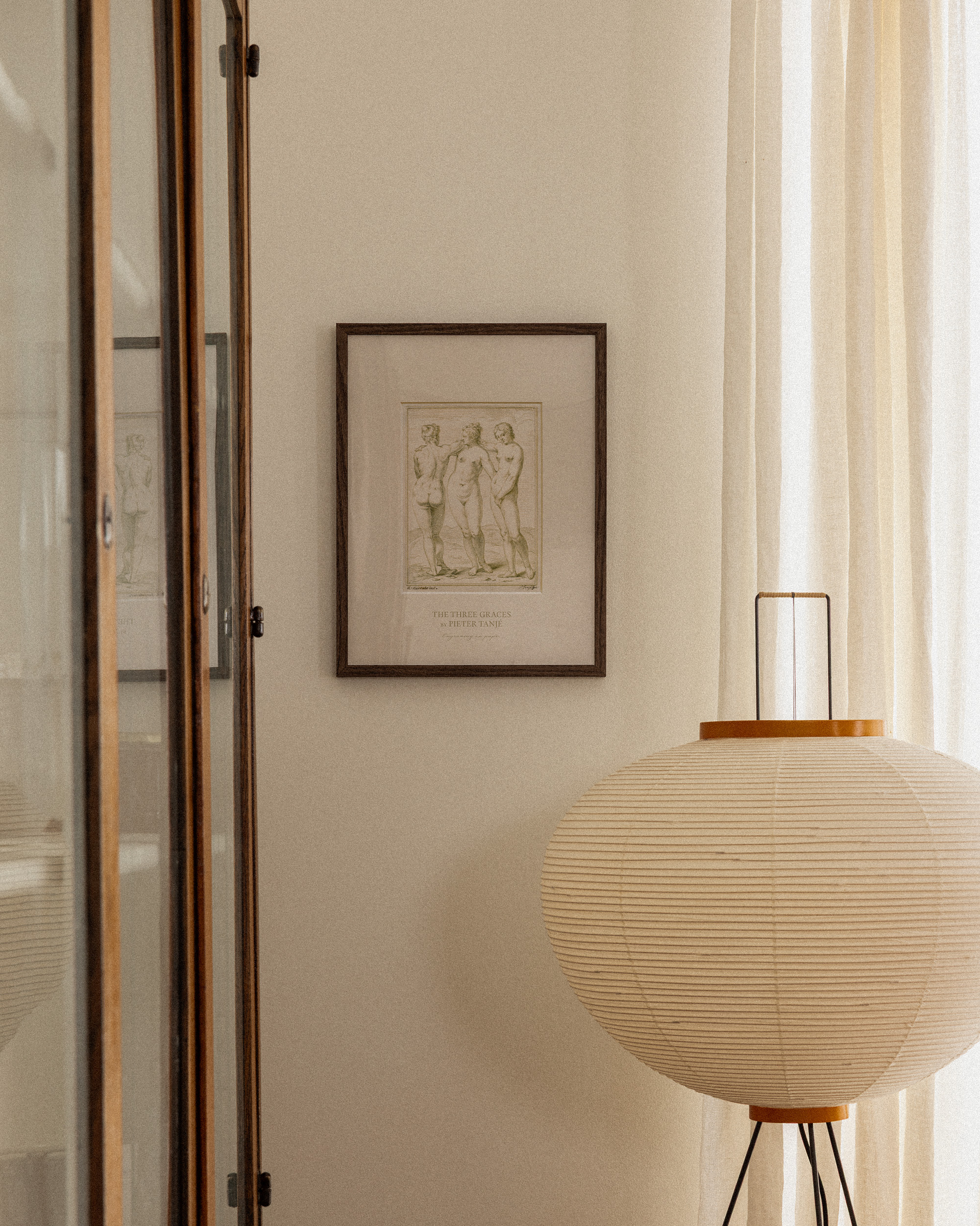 Une affiche classique représentant un ensemble de trois figures nues se tenant debout, dessinées avec de fines lignes et un ombrage délicat sur fond beige clair.