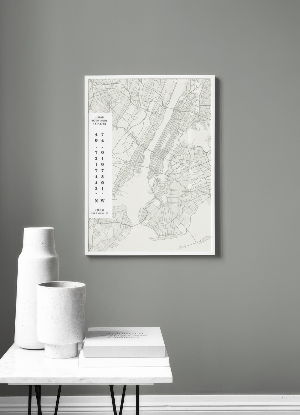 Plan de ville en gris clair et vert avec un encadré à gauche contenant des lettres et des chiffres. Des affiches personnalisées vous permettent de personnaliser votre affiche en ajoutant vos propres texte, noms ou dates. C’est une façon amusante de personnaliser votre propre art ou d’offrir un cadeau à quelqu’un.