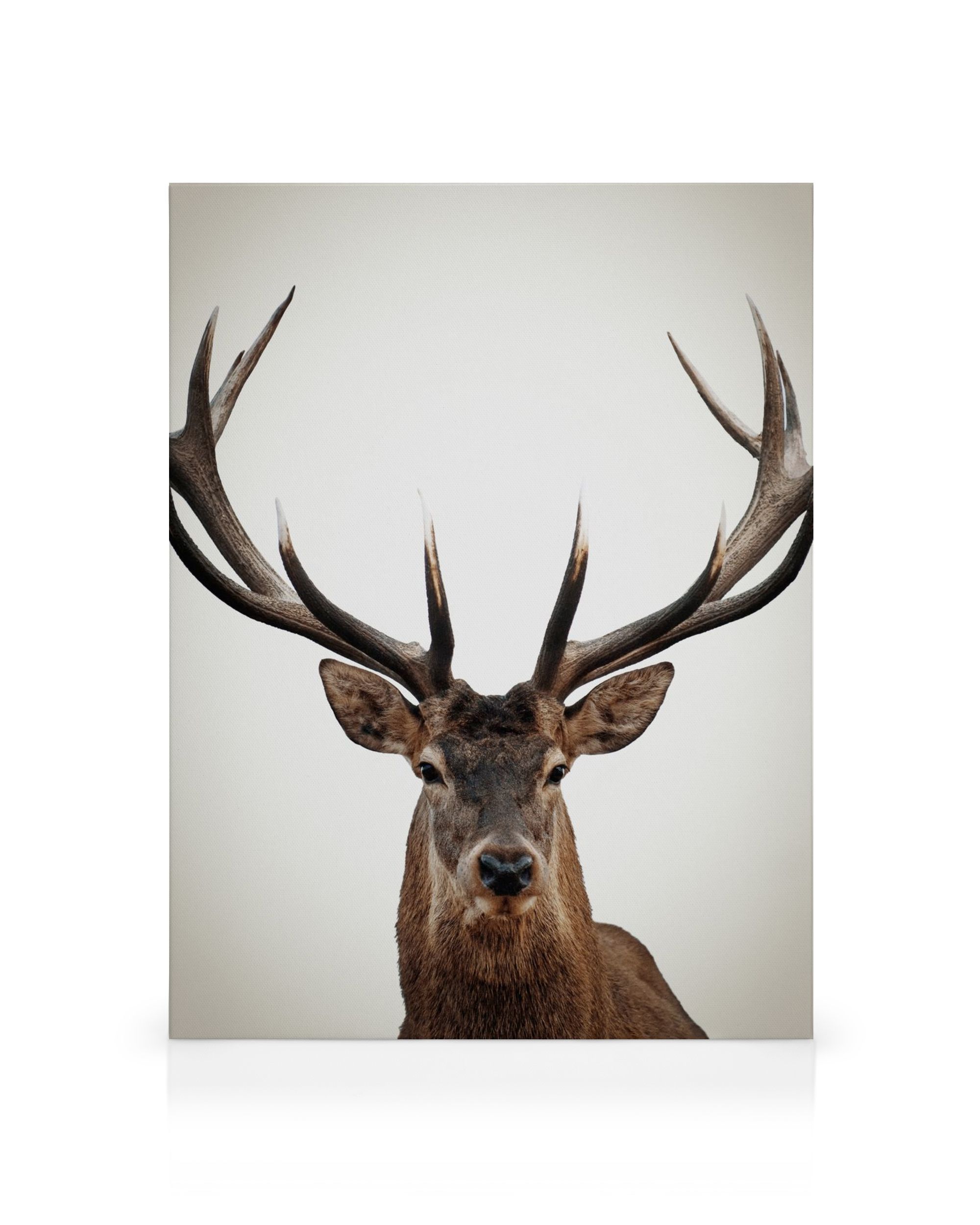 À partir de 7,80 €Une magnifique toile représentant un majestueux cerf brun regardant vers l'avant, sur un fond blanc. La photo réaliste montre en détail les impressionnants bois ramifiés du cerf ainsi que ses yeux sombres et la couleur unique de sa fourrure.