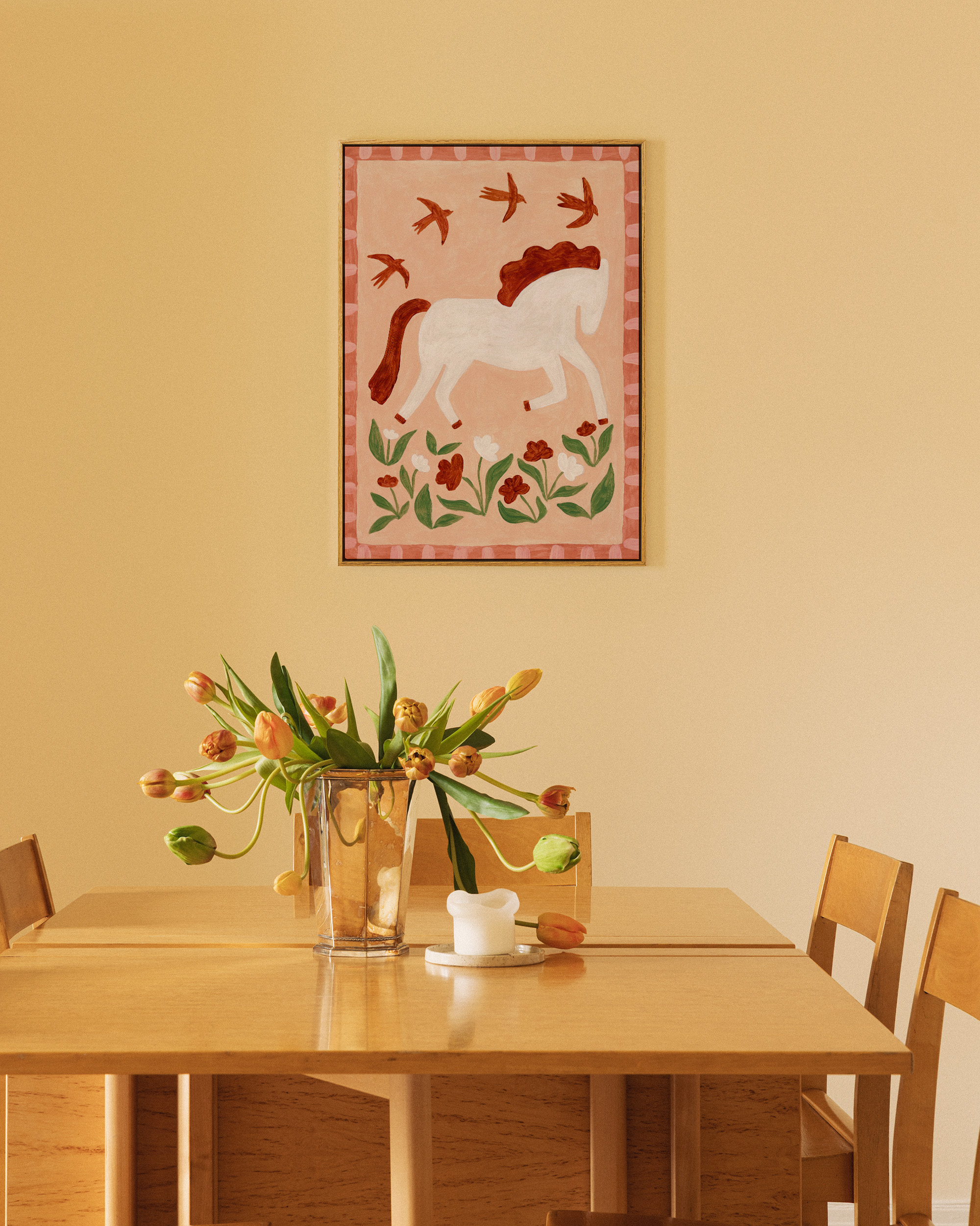 À partir de 19,96 €Une toile représentant un cheval blanc à la crinière brune, accompagné d’oiseaux en vol et de fleurs roses, sur un fond pêche doux avec une bordure rose.