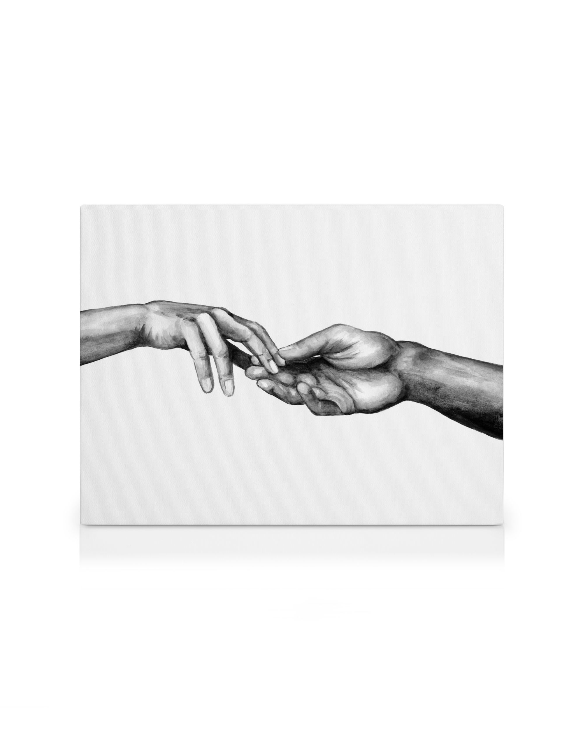 À partir de 24,95 €Cette simple mais puissante toile en noir et blanc illustre deux mains, l'une à la peau claire et l'autre à la peau foncée, sur le point de se toucher contre un fond blanc.