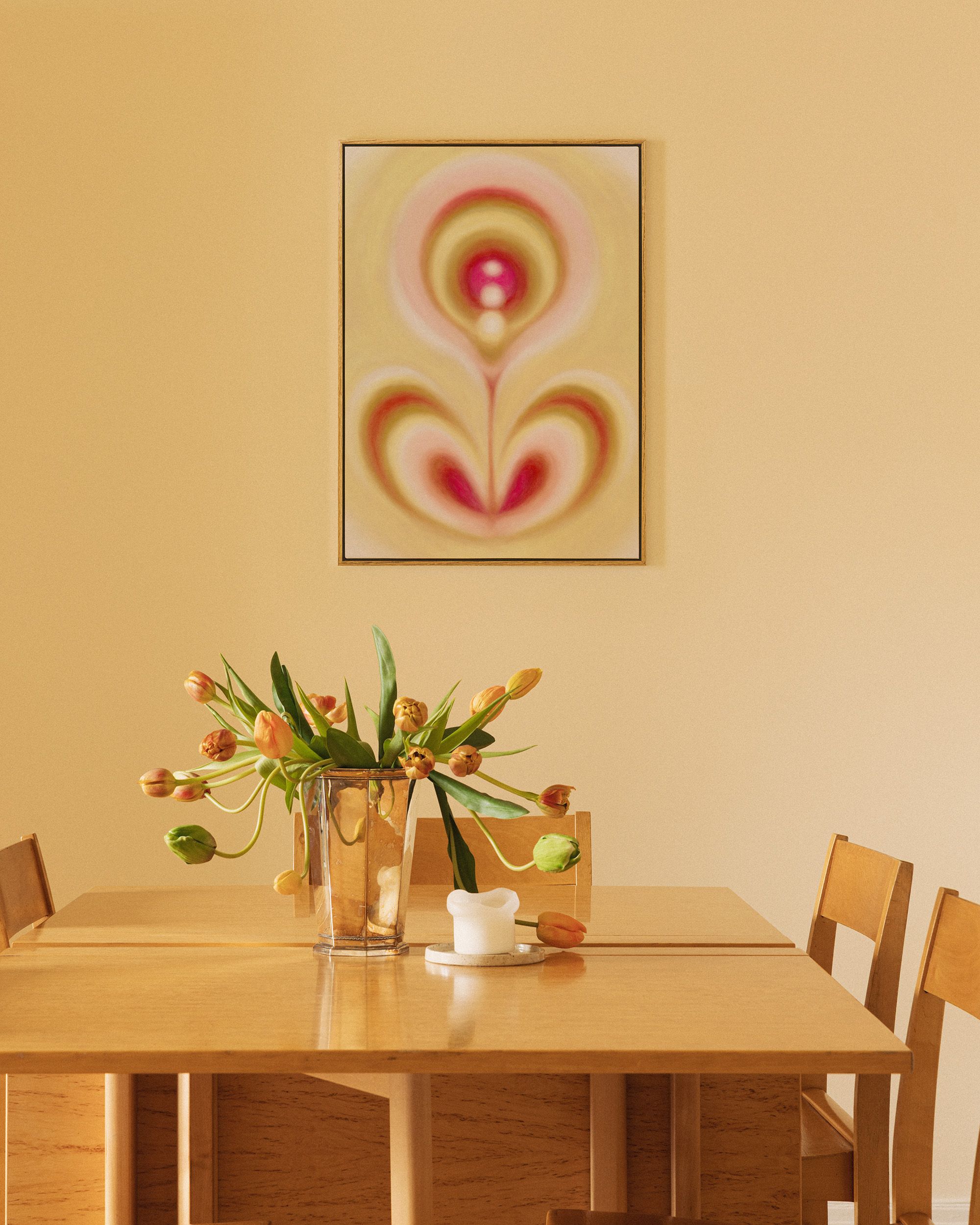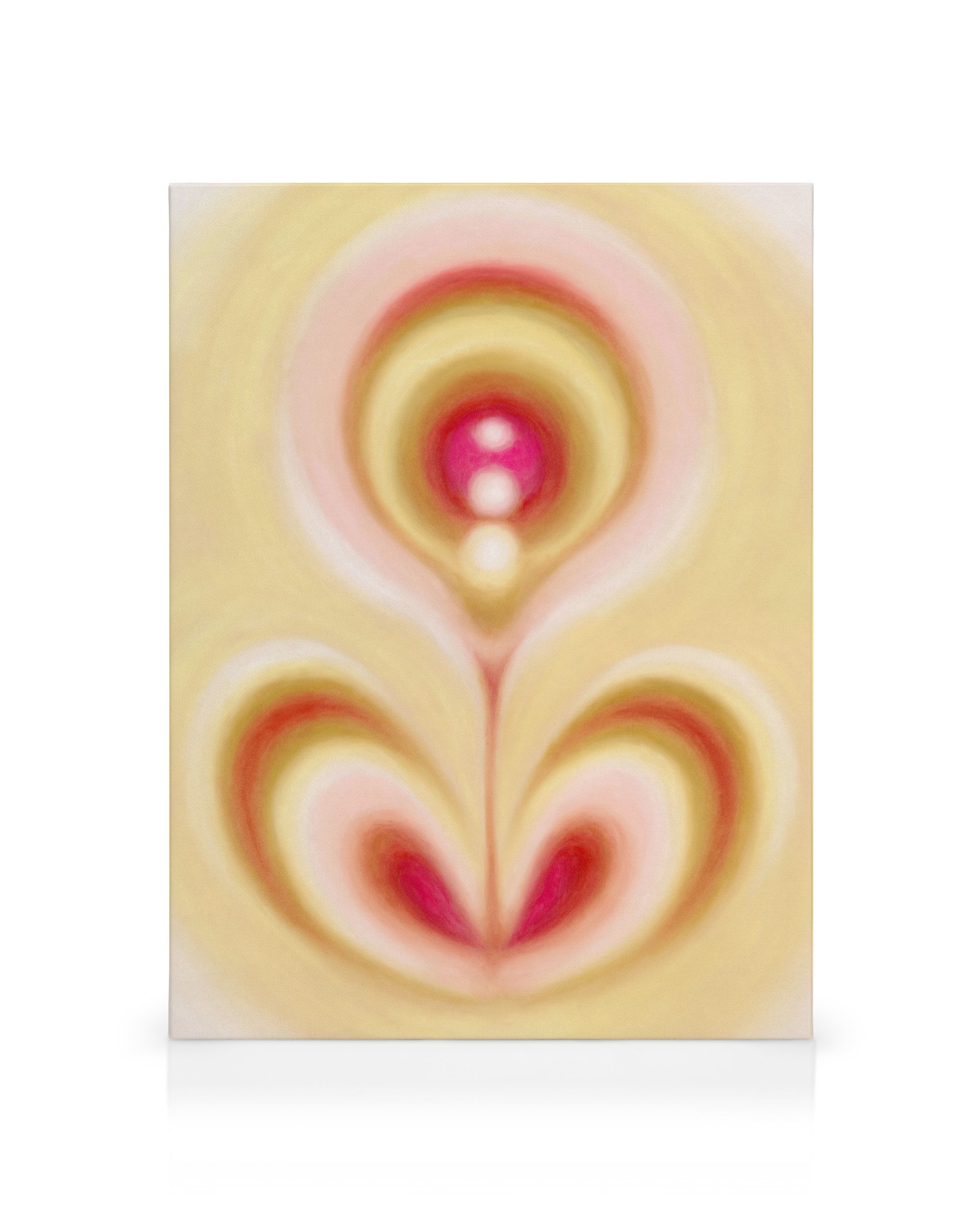 Une toile abstraite aux formes douces et symétriques en rose, jaune et blanc. La forme centrale, évoquant une fleur, apporte une touche chaleureuse et lumineuse sur un fond jaune clair.