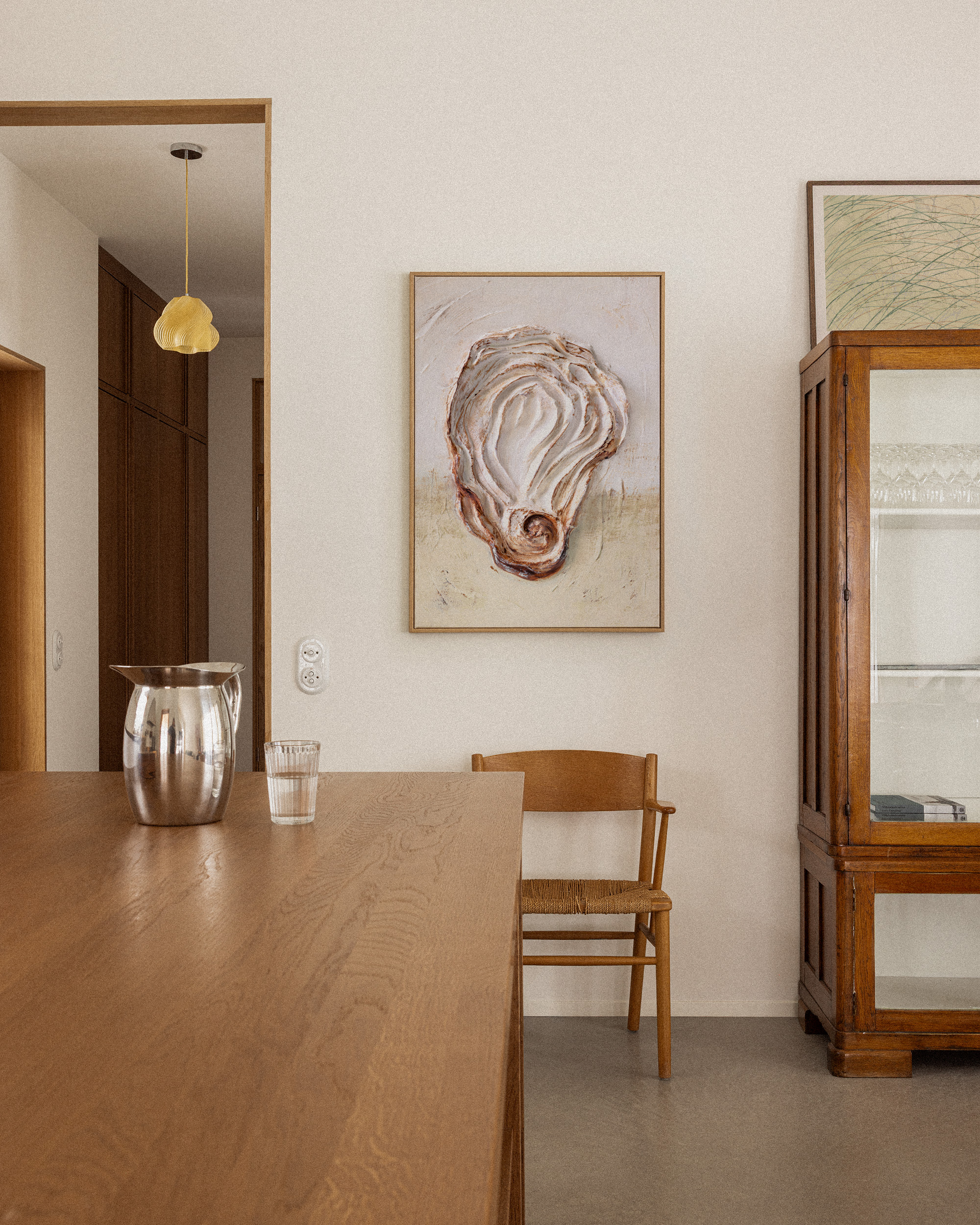 Une toile représentant une forme abstraite de coquille d’huître, avec des crêtes ondulées et superposées dans des tons de blanc, marron et beige.