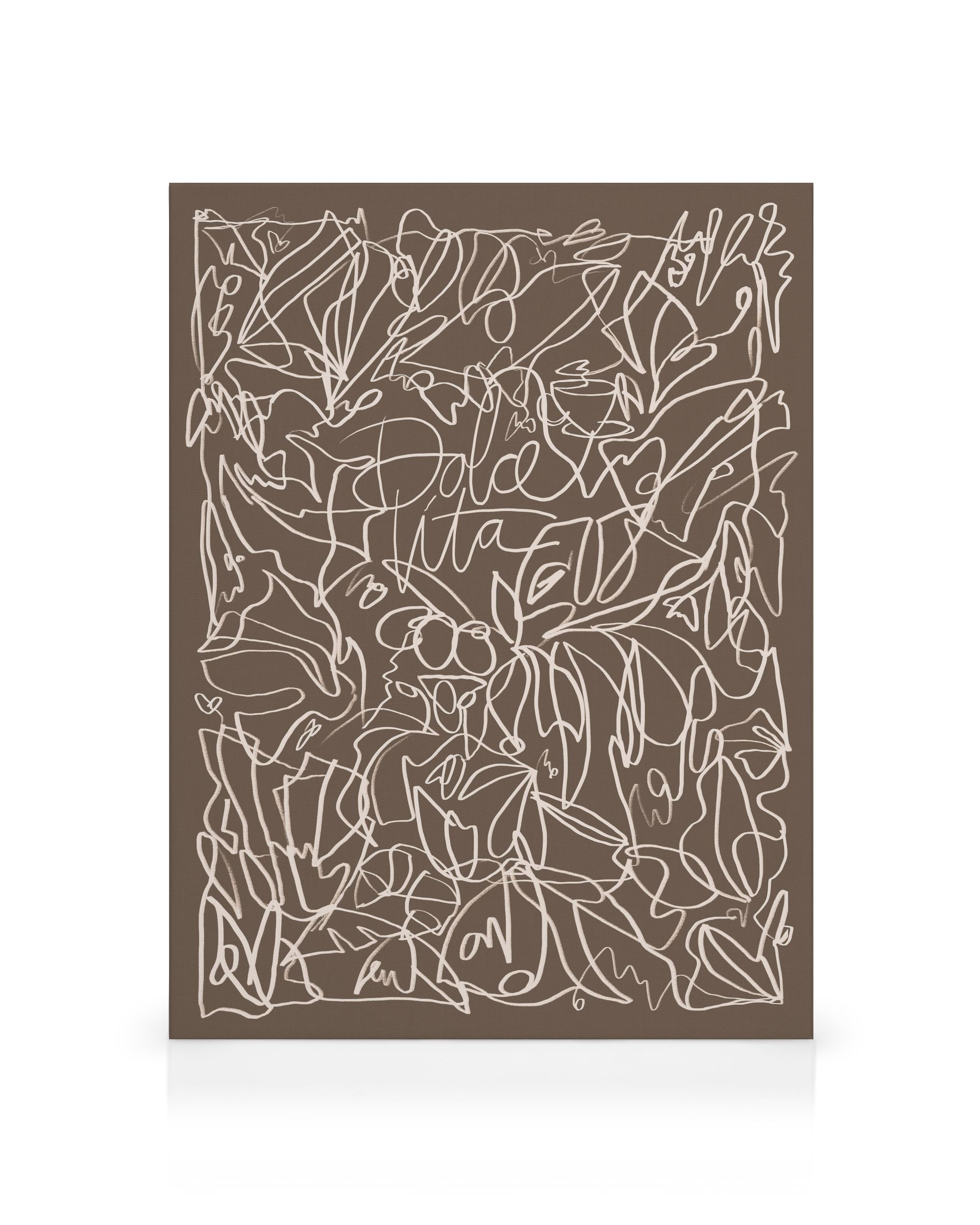 Une toile aux lignes blanches abstraites sur un fond marron, formant un motif ludique et dynamique. La phrase « Dolce Vita » s’intègre subtilement parmi les lignes blanches.