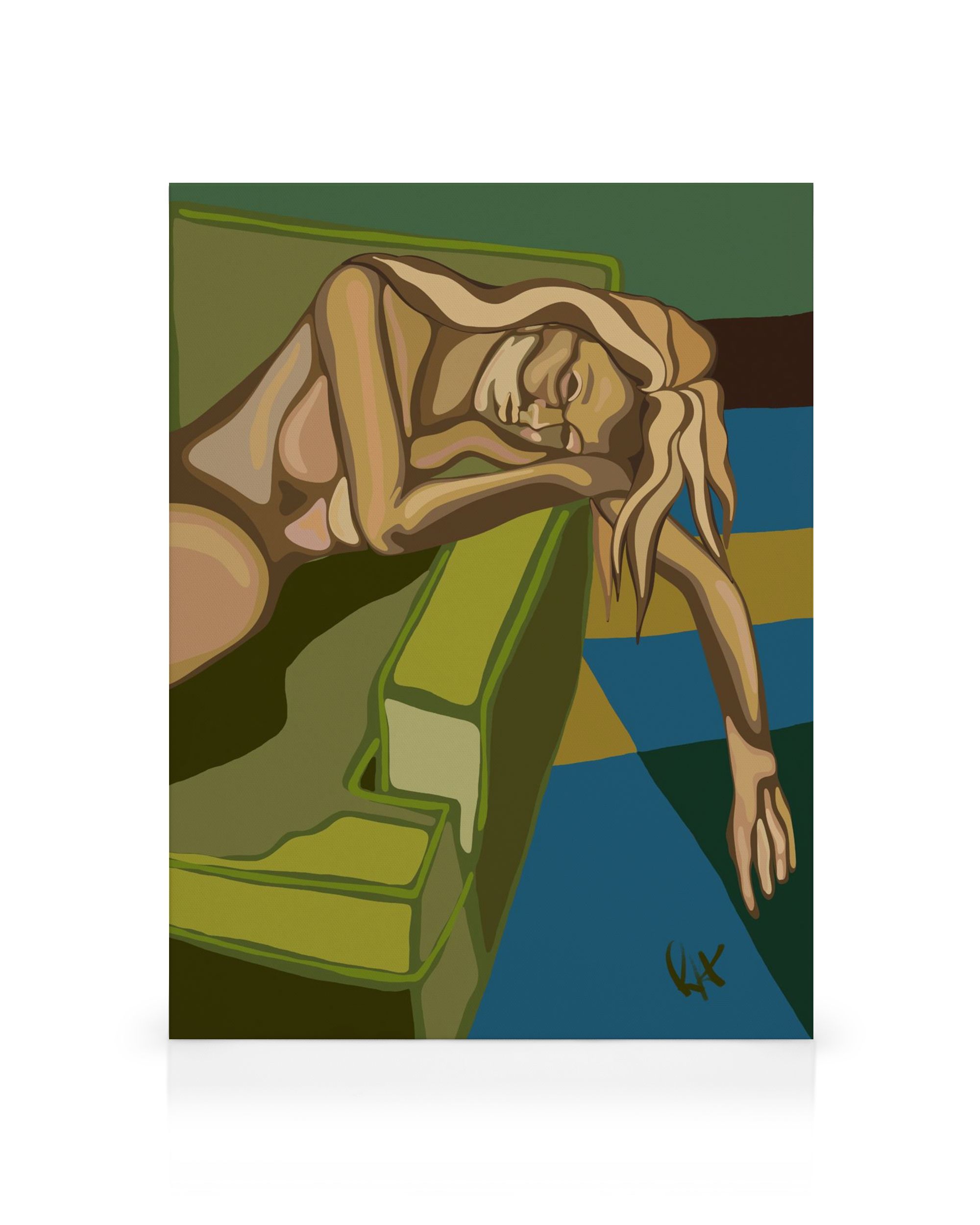 Une toile moderne avec des lignes audacieuses et des formes géométriques en jaune, bleu et vert foncé, mettant en avant une figure abstraite aux cheveux longs.