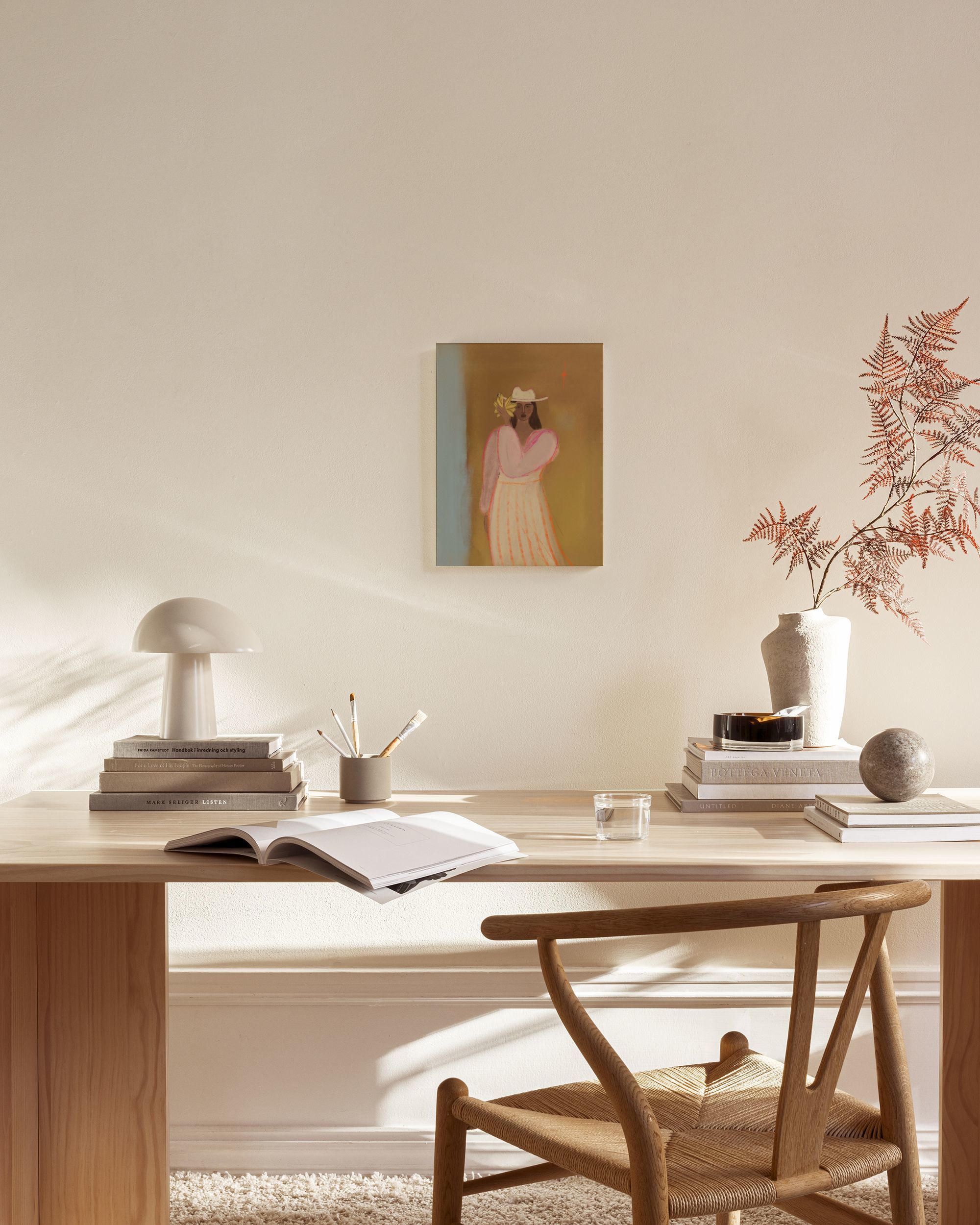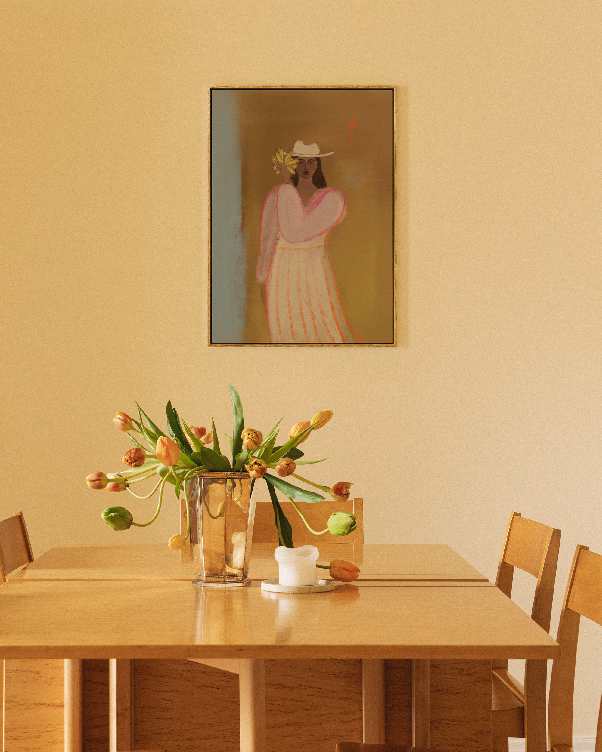 À partir de 19,96 €Une toile représentant une personne en robe rayée rose et orange, tenant des bananes et portant un chapeau à larges bords blanc. Peinte dans des tons doux et chauds de beige, rose et orange.