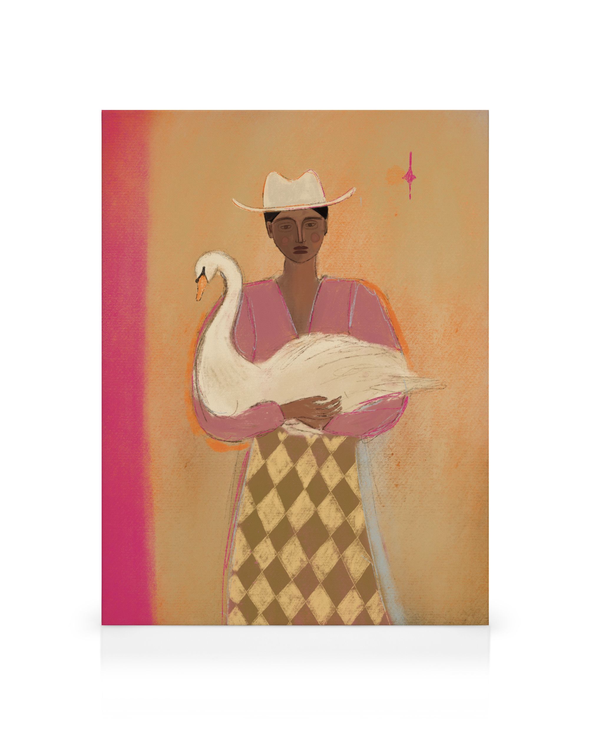 Une toile représentant une personne portant un chapeau blanc et une tenue rose, tenant un cygne blanc, sur un fond aux nuances douces d’orange et de rose.