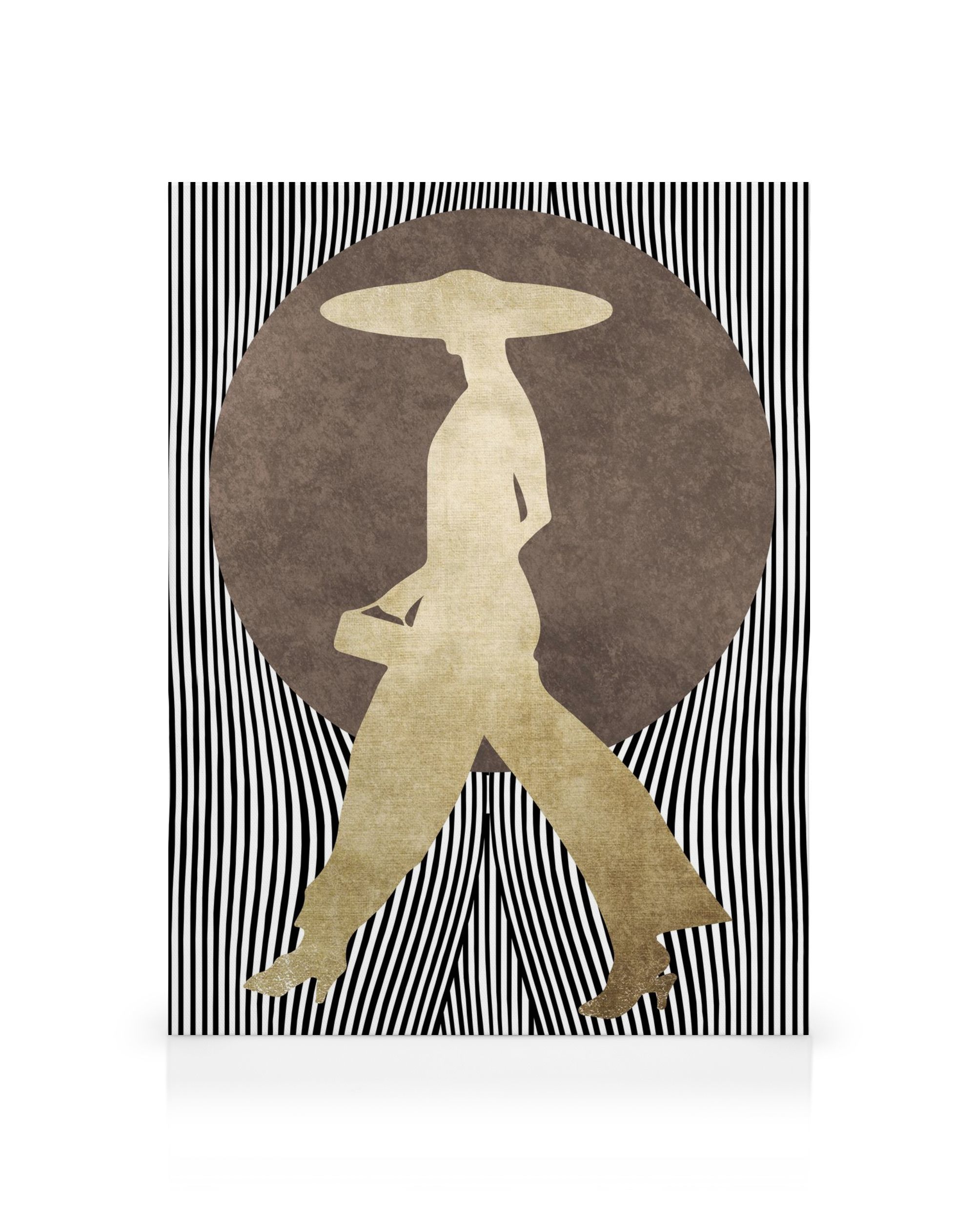 À partir de 9,87 €Une toile accrocheuse avec un fond rayé noir et blanc et une personne marchant avec un parapluie, découpée pour révéler un motif de cercle marron en dessous. Cet art mural élégant a une touche avant-gardiste qui ajoutera de l'intérêt à toute décoration murale.