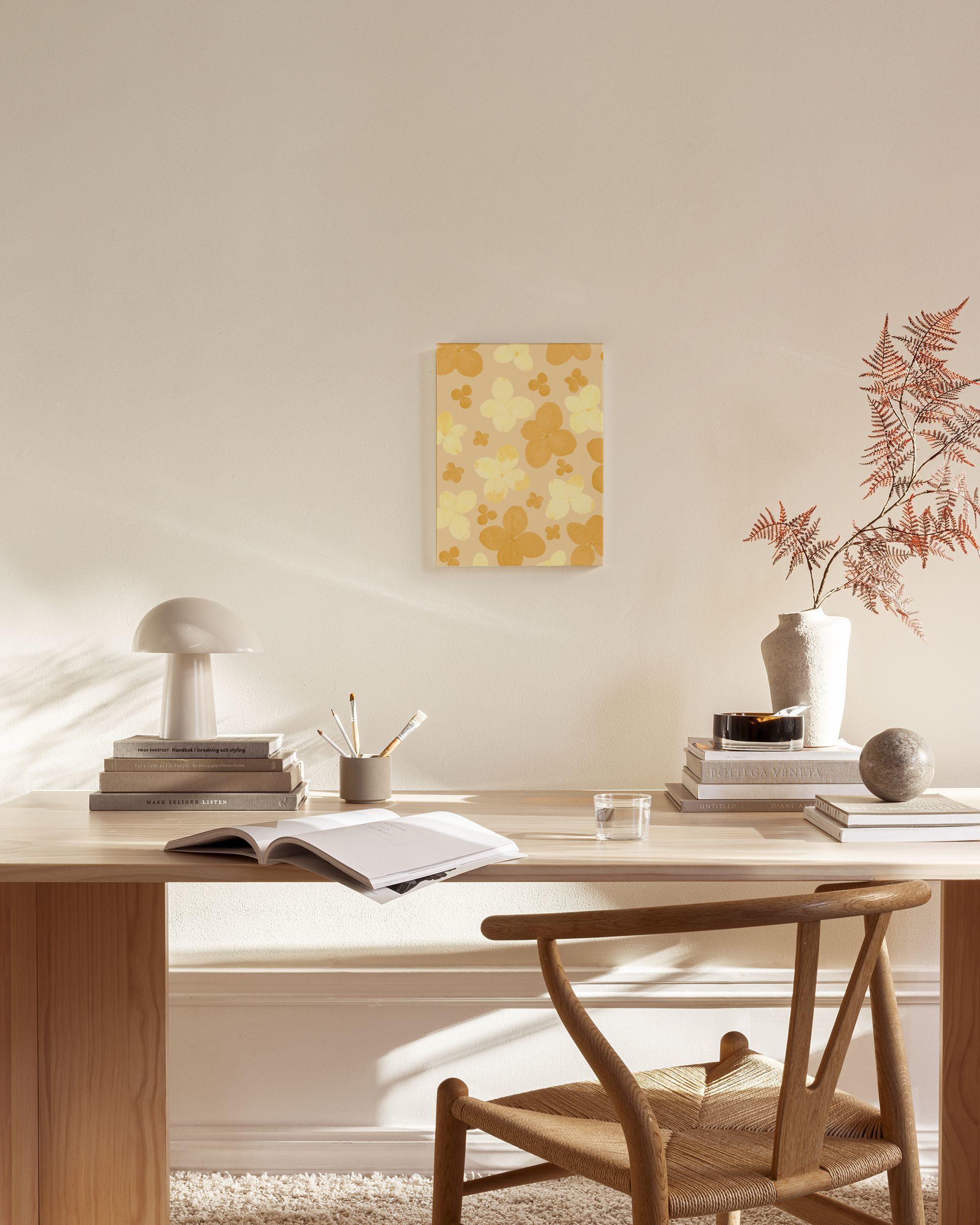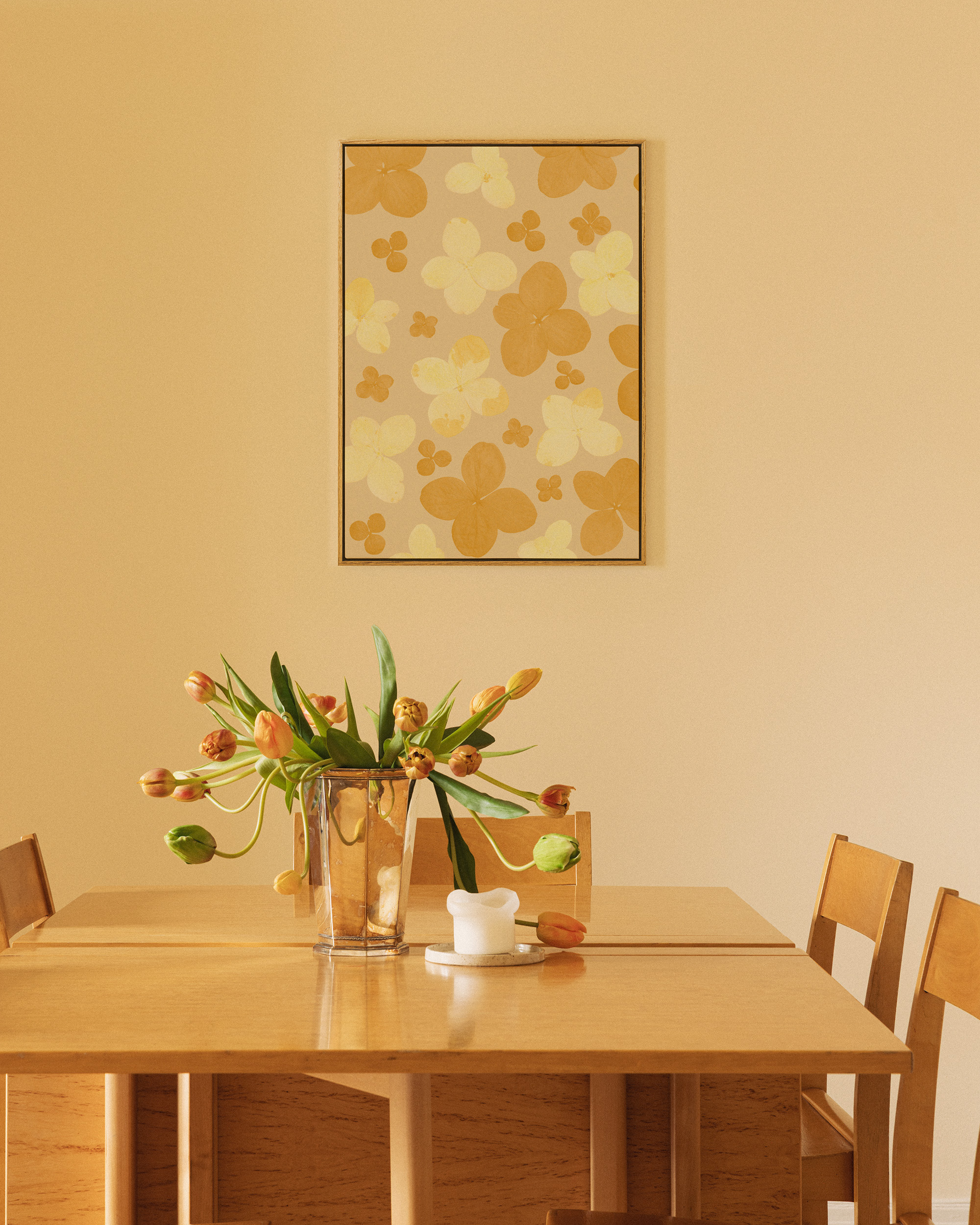 Une toile présentant un motif de fleurs jaunes et oranges sur un fond beige. Idéale pour apporter de la couleur et de la gaieté à votre intérieur !