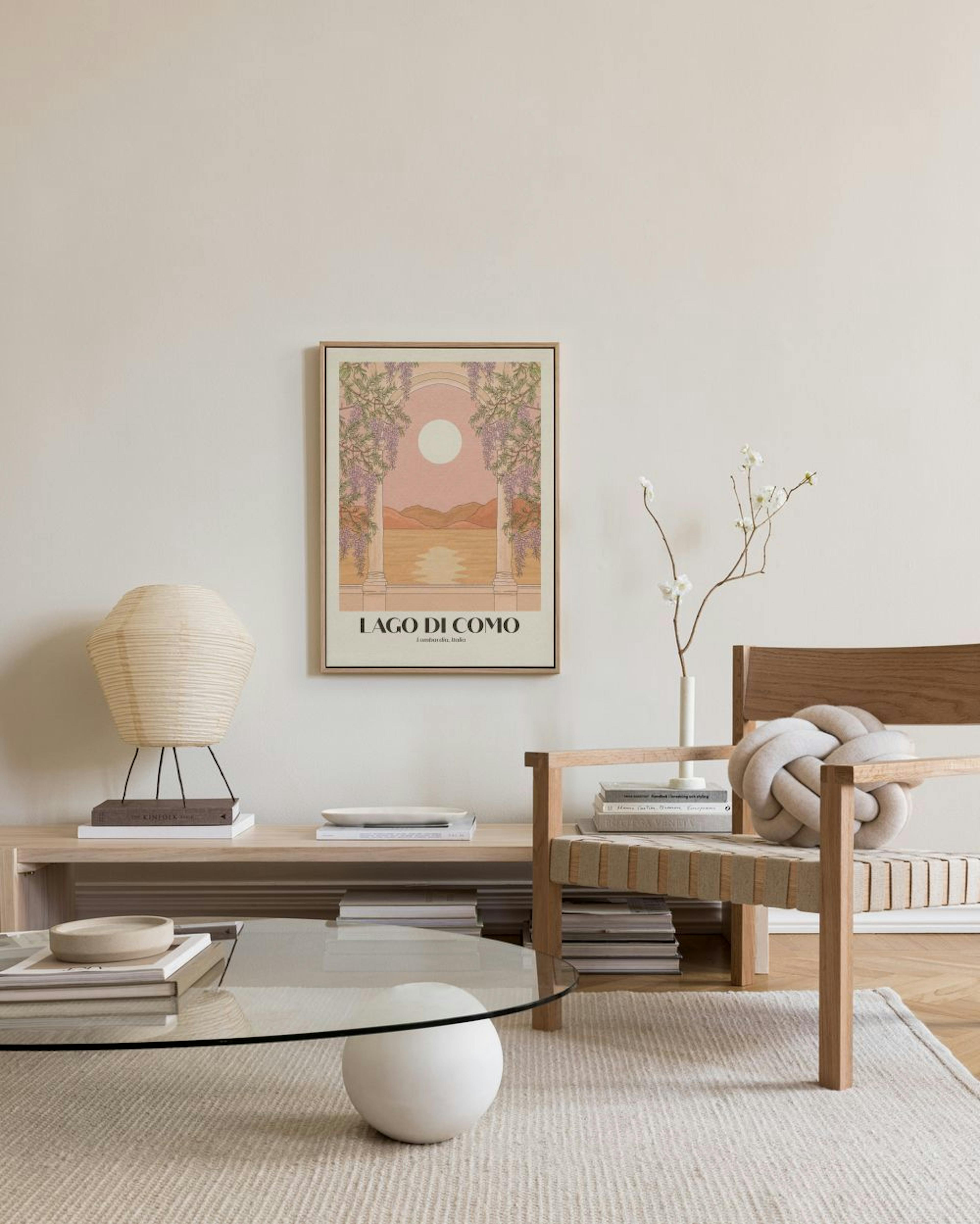 À partir de 24,95 €Magnifique impression sur toile représentant une arche avec des fleurs violettes suspendues encadrant un coucher de soleil sur les montagnes et l'eau. Le texte indique "Lago Di Como Lombardia, Italia" sur un fond beige. Cette décoration murale présente des couleurs pastel douces qui illumineront n'importe quelle pièce.