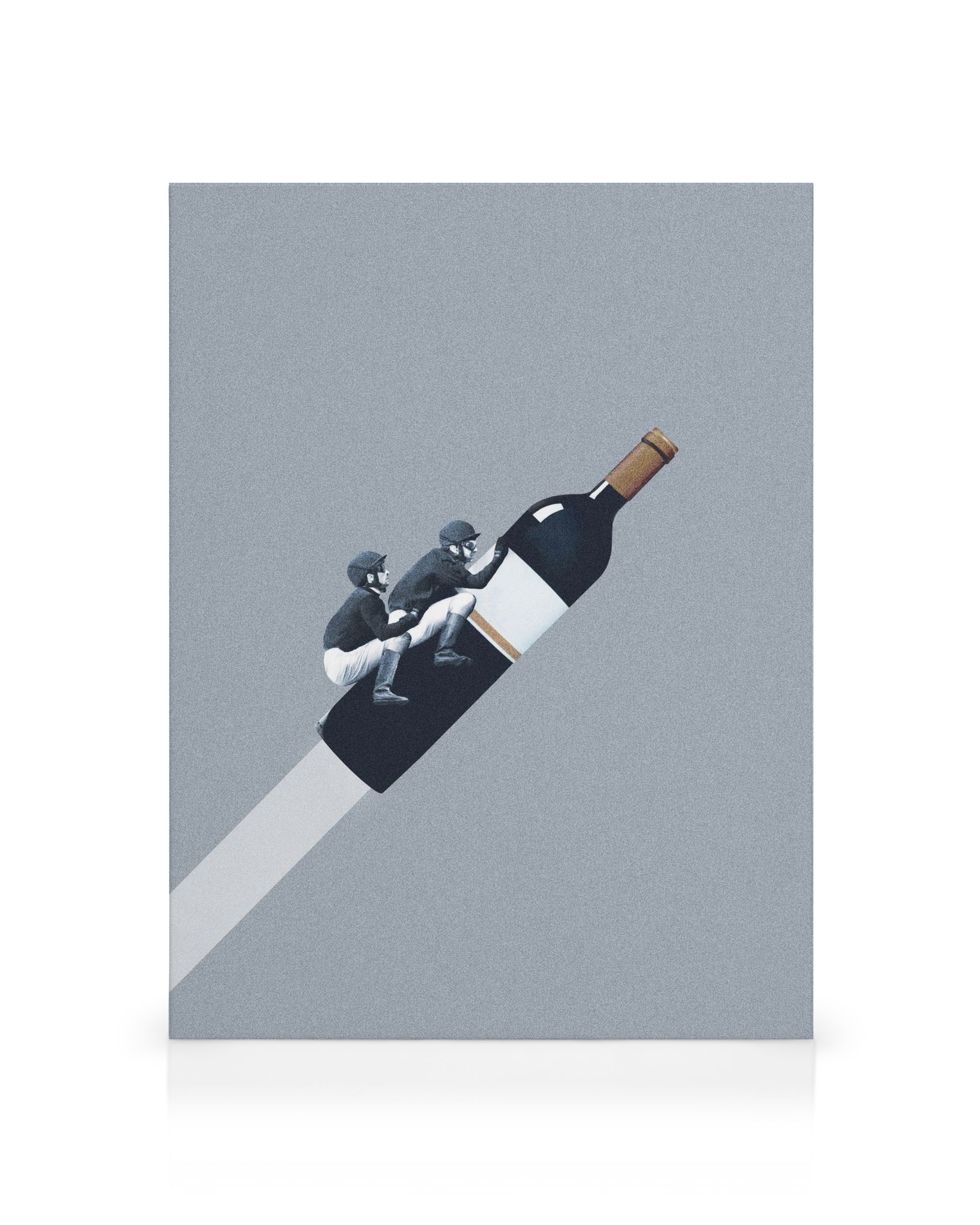 À partir de 19,95 €Une toile surréaliste montrant deux personnes miniatures assises sur une bouteille de vin noir et blanc, semblant glisser sur une grande allumette, sur un fond gris uni.