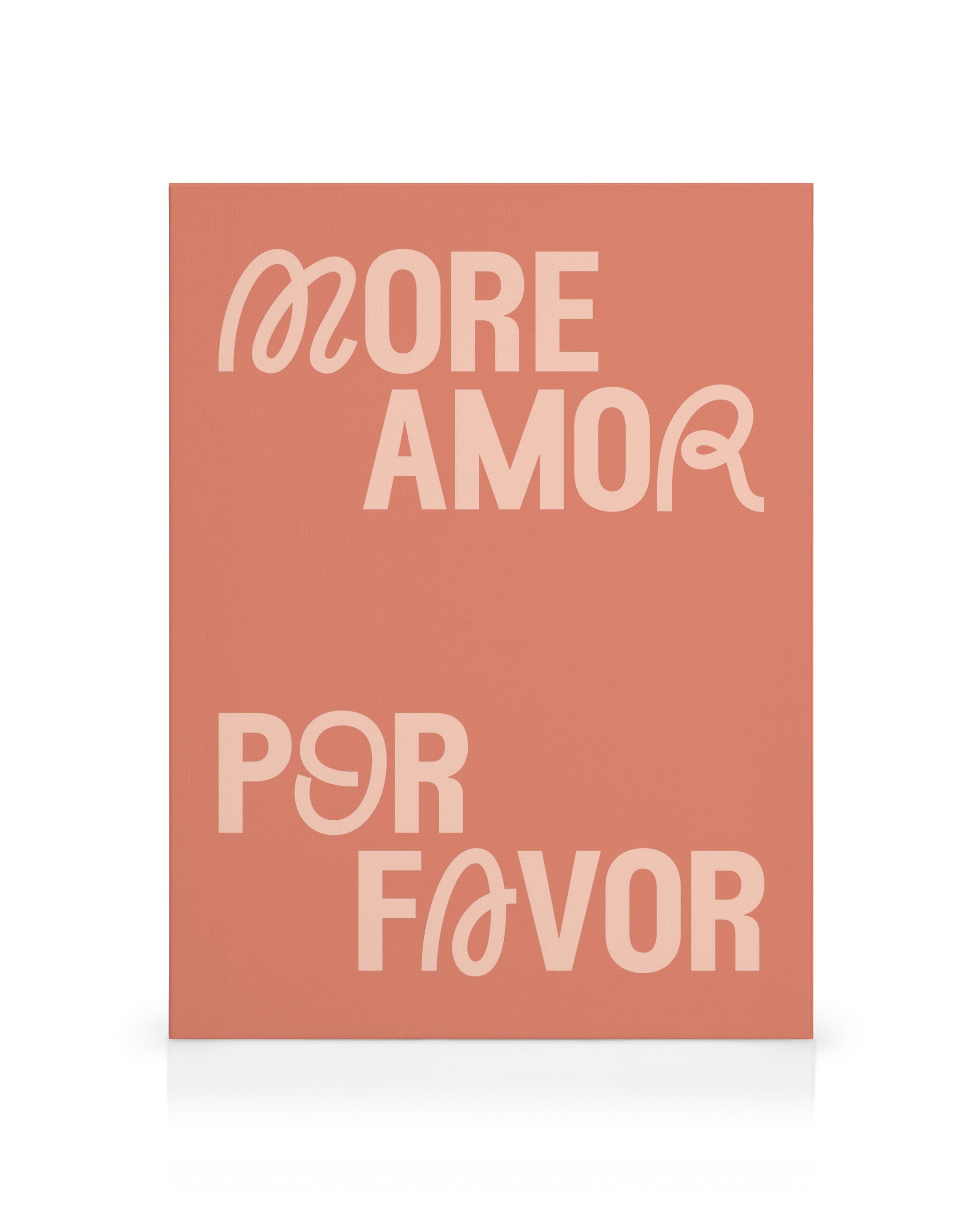 Une toile avec un texte blanc sur un fond pêche. Les mots « More Amor » et « Por Favor » sont présentés dans un style simple et moderne, mêlant lettres droites et courbées.