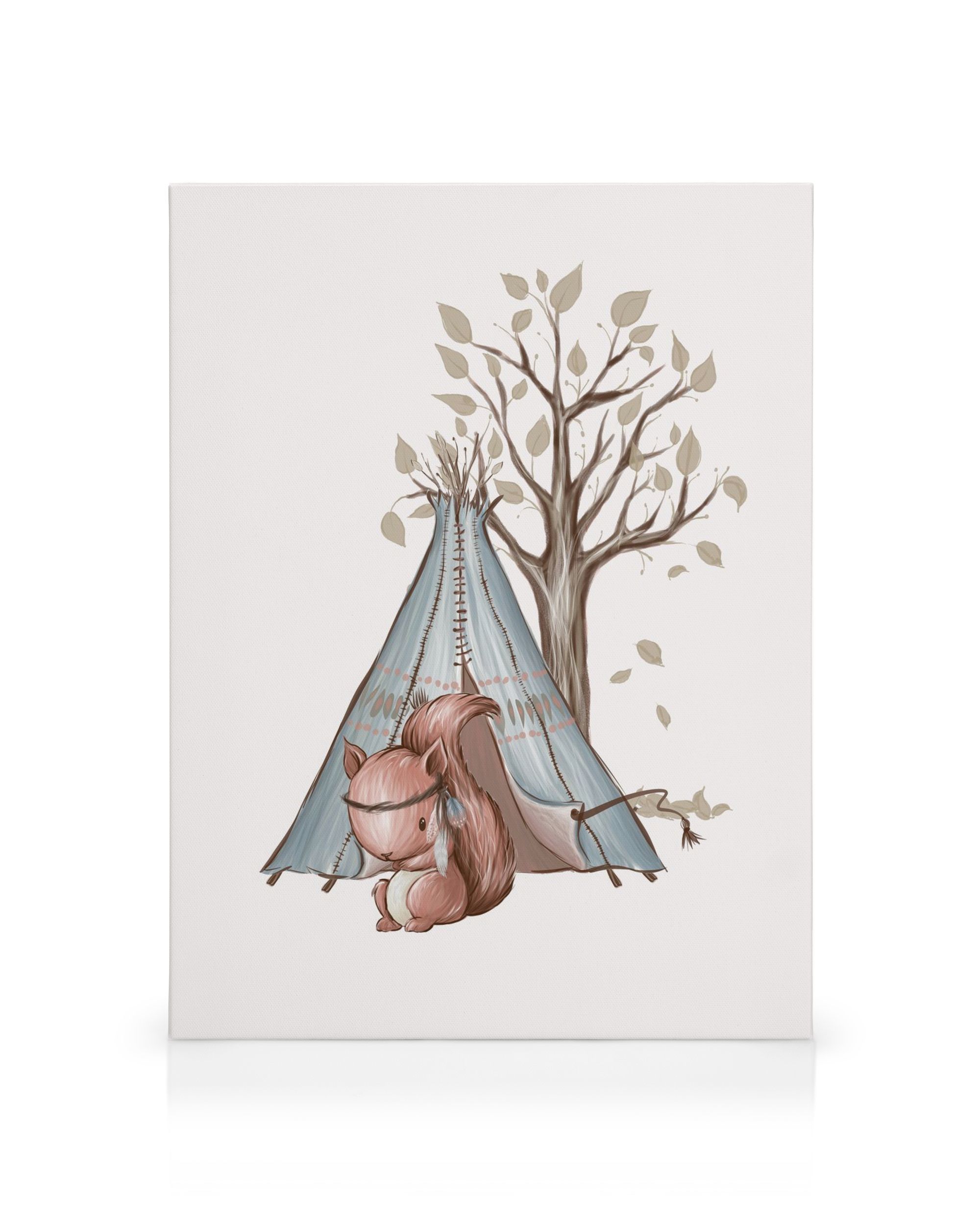 À partir de 24,95 €Une charmante toile représentant un tipi bleu avec un tronc d'arbre en croissance, orné de feuilles vertes. Un écureuil espiègle pointe son nez depuis l'ouverture du tipi sur cette adorable décoration murale pour chambre d'enfant.