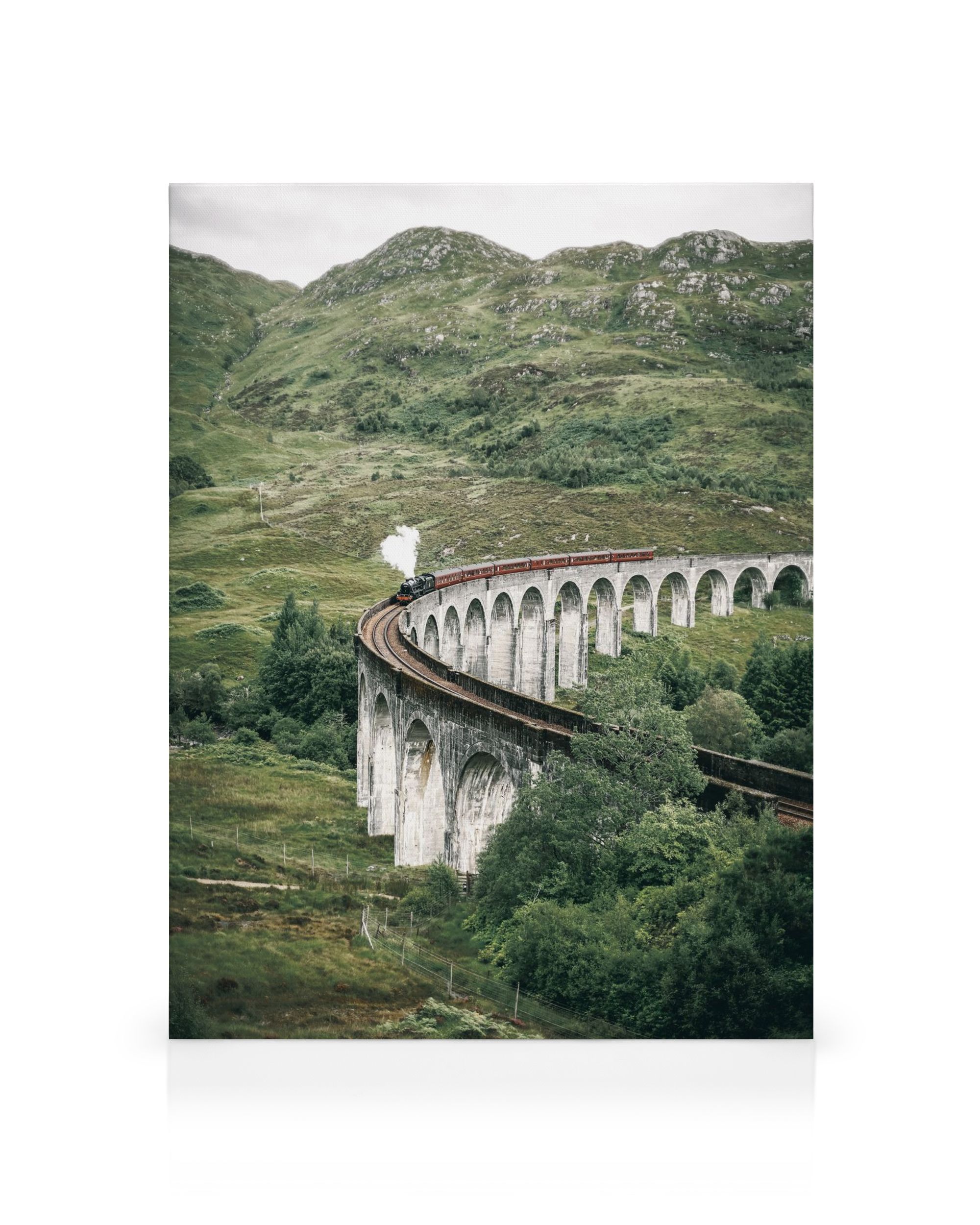 À partir de 19,96 €Une belle toile d'un vieux train à vapeur traversant un pont en arc de pierre parmi des collines vertes. Le train rouge et noir émet de la fumée alors qu'il traverse le pont gris au-dessus de la vallée herbeuse.