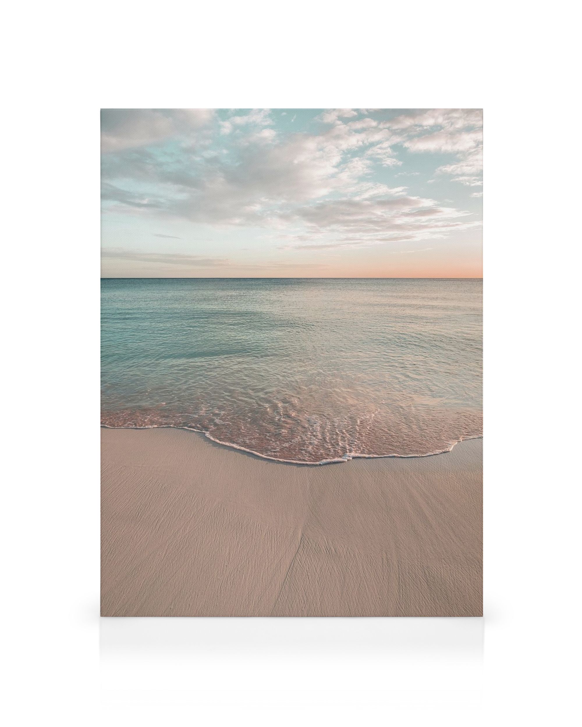 À partir de 24,95 €Une toile tranquille représentant une plage au lever du soleil. La scène montre du sable lisse, une eau bleue calme et un ciel rose et bleu doux avec des nuages. Cette décoration murale est parfaite pour créer une atmosphère paisible dans votre maison.