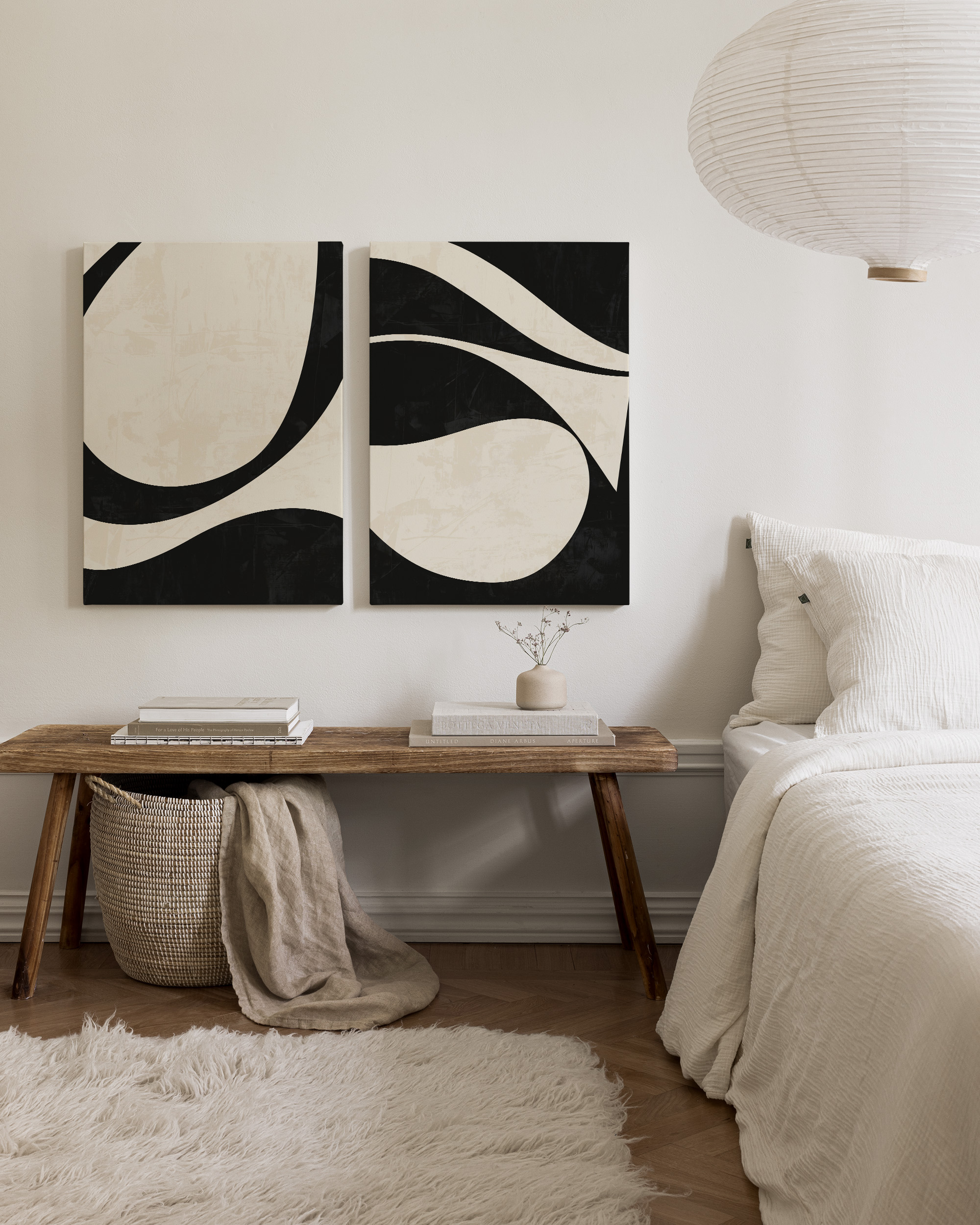 Deux toiles abstraites aux tons noirs et beiges. Des tableaux parfaits pour habiller vos murs avec élégance, dans votre chambre ou votre salon.