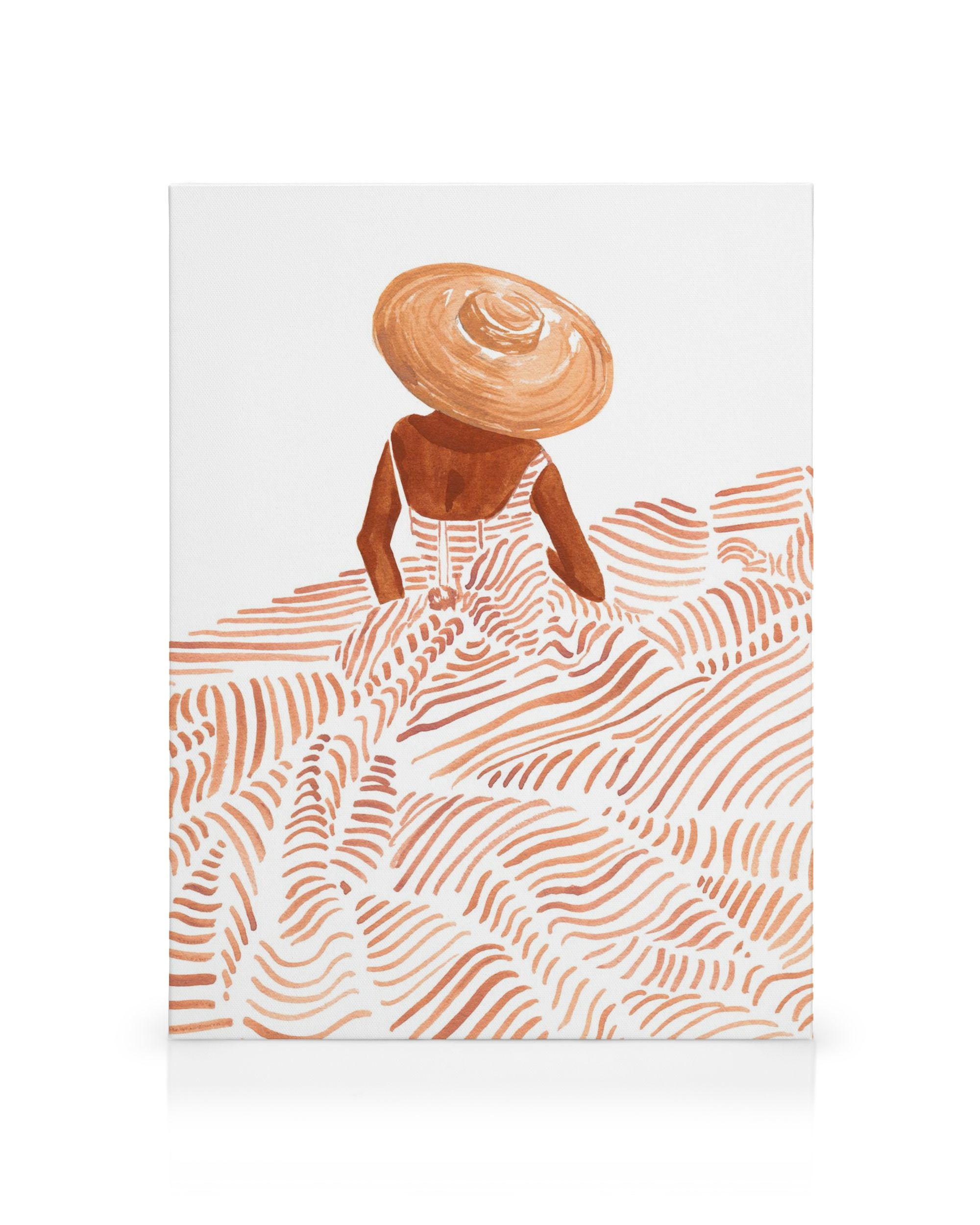 À partir de 13,17 €Une toile intrigante illustrant une personne portant un grand chapeau assise sur une surface brune à motifs, sur un fond blanc, représentée dans un style simple mais texturé.